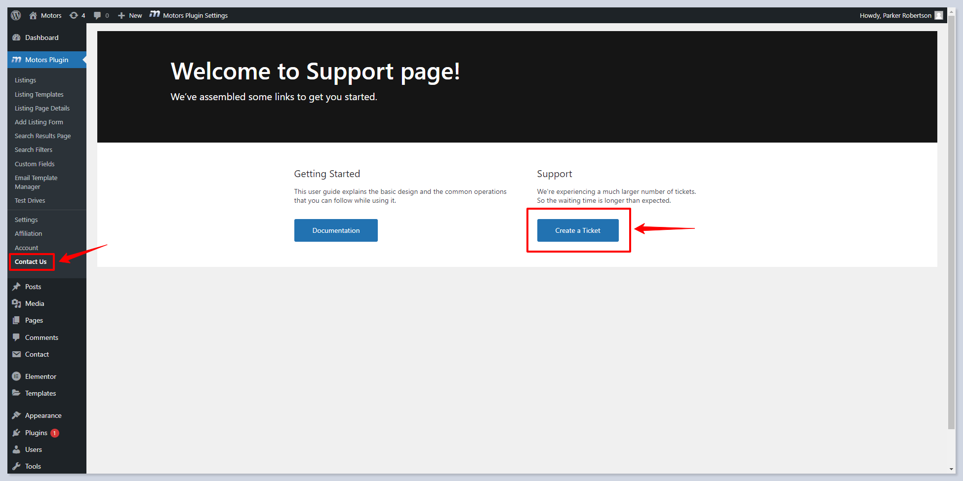 If you have not created a support account on our platform yet, go to the **Dashboard > Motors Plugin > Contact** us and click Create a Ticket button to submit a new ticket and create a support account quickly.