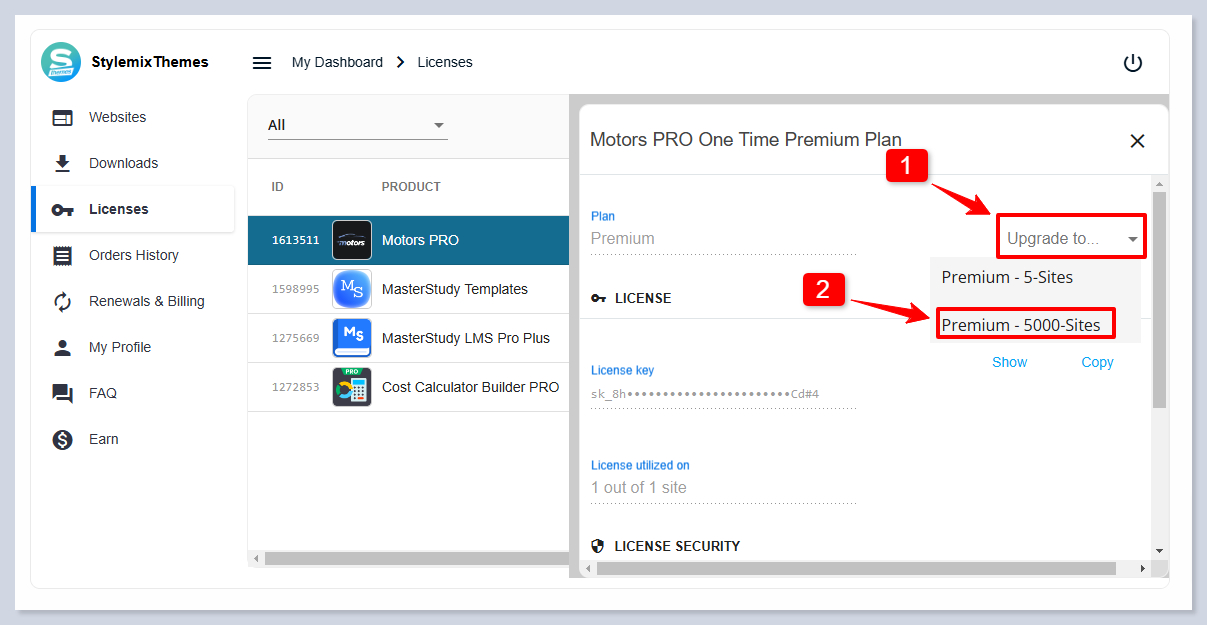 In the **Motors**, you have the option to upgrade your license to cover more sites or switch to a Lifetime plan or bigger plans. When upgrading from your current plan, you will only be charged a prorated amount, factoring in what you have already paid.