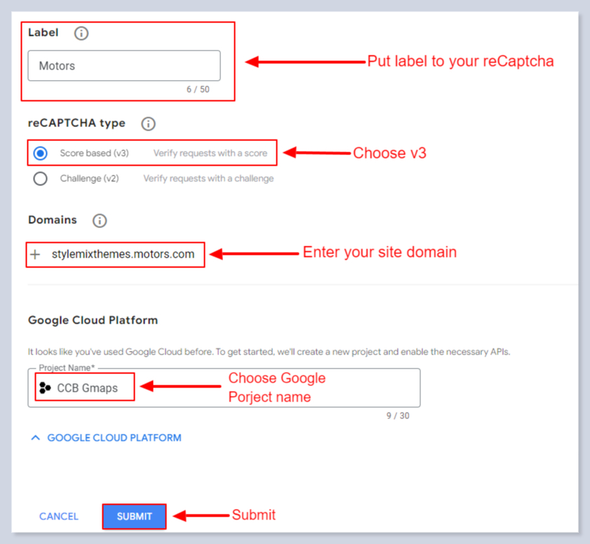 After visiting the [link](https://www.google.com/u/0/recaptcha/admin/create) provided, you can fill in the form fields like this: