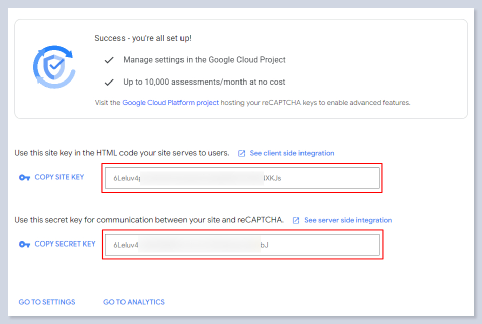> To obtain the keys for Google reCAPTCHA please follow this link: [https://www.google.com/u/0/recaptcha/admin/create> ](https://www.google.com/u/0/recaptcha/admin/create)