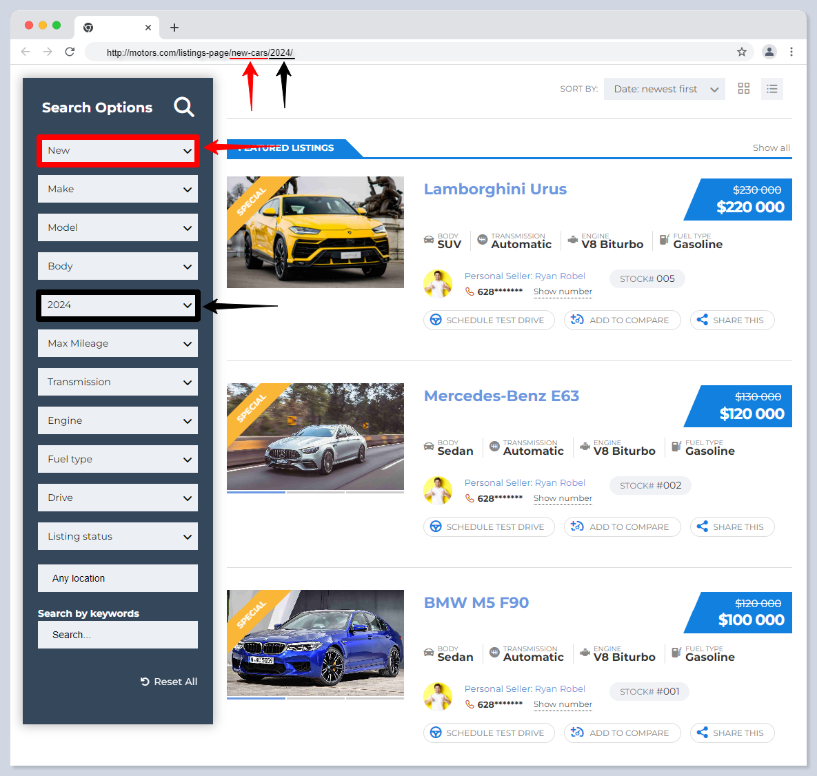 When this option is enabled, all listing links leading to the Inventory page will be turned into SEO-friendly URLs. This helps improve your website’s search engine optimization, making it easier for search engines to index and rank your listing pages.&#x20;