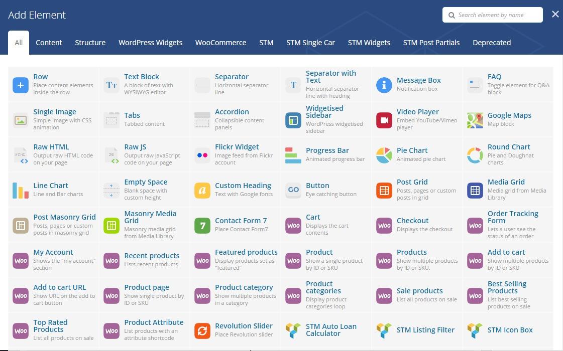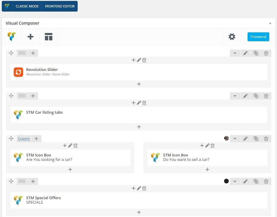 All pages can be created as simple content pages or built by means of Visual Composer page builder. You will need to first set up the page and then add and set up content blocks. Just add a row and add the modules to row from the Visual Composer dashboard.