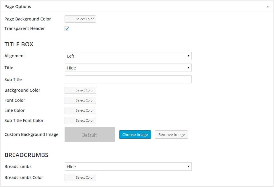 Besides this, each page contains these options which include header color or background image, title fonts and colors, breadcrumbs and button settings: