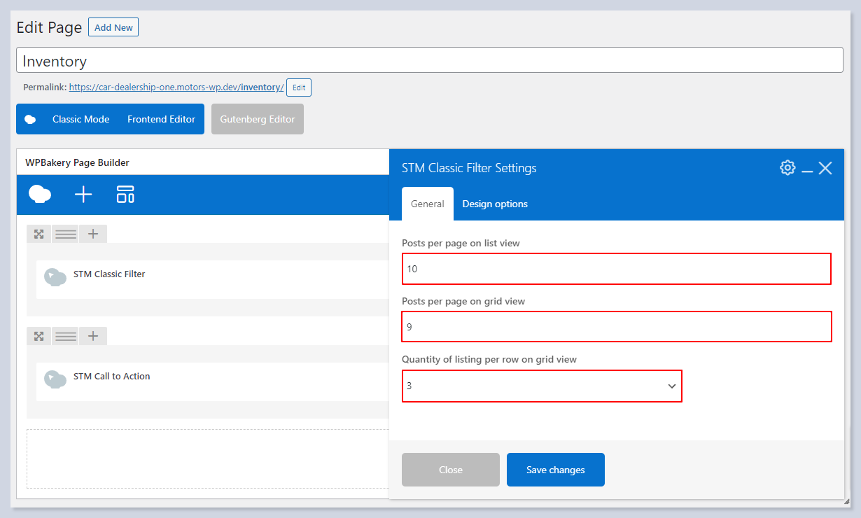 To create a Classic Inventory with WPBakery Page builder the "STM Classic Filter" module should be added to the page.