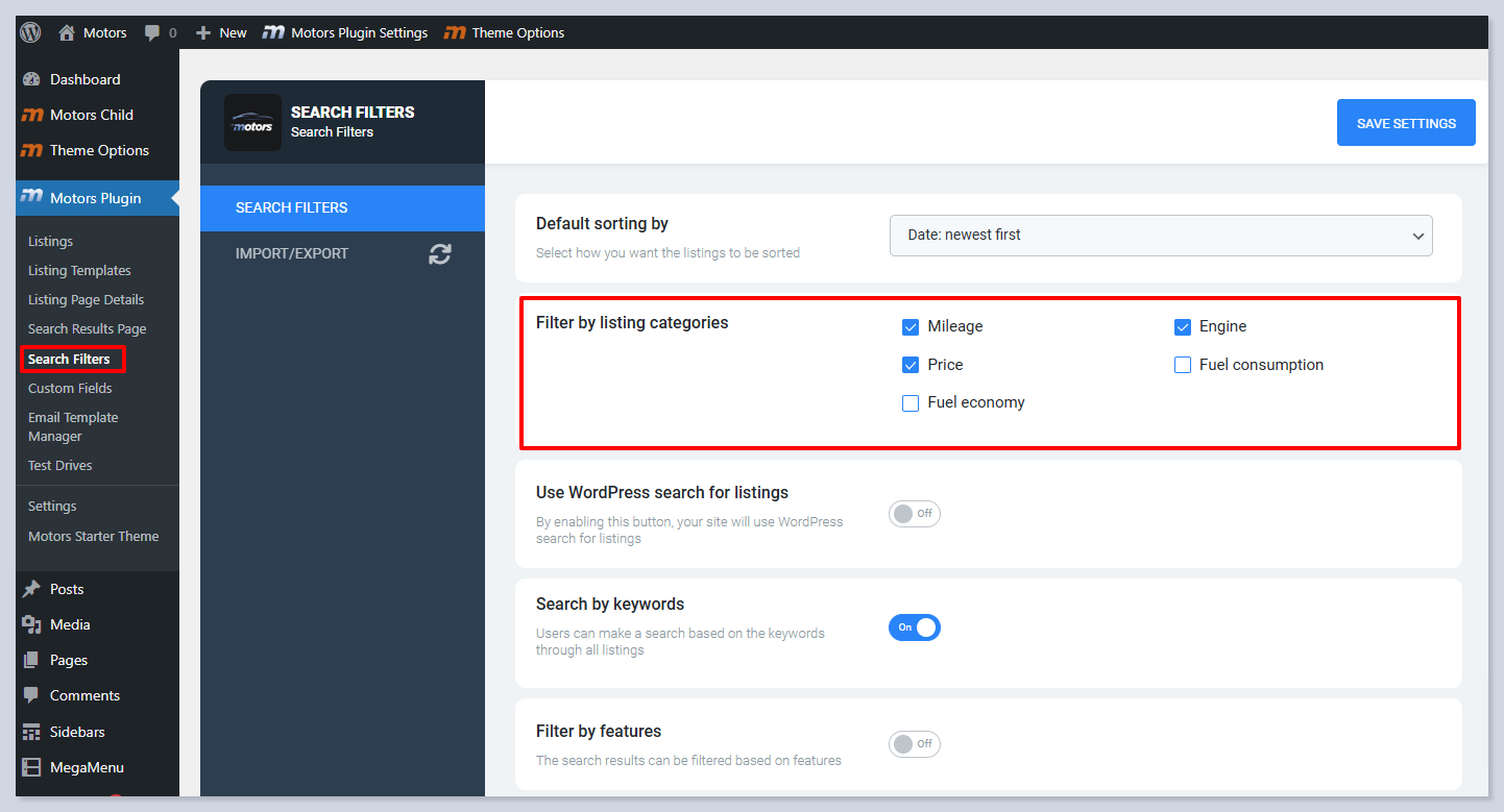 The Sorting options are set from **WP Dashboard > Motors Plugin > Search Filters** section directly:
