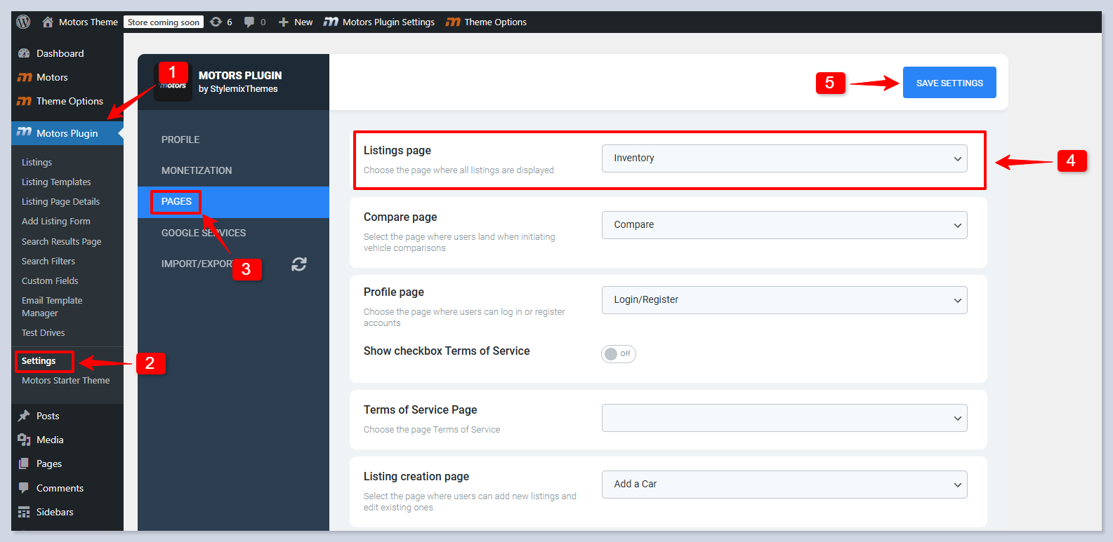 Search Results (Inventory) page can be indicated by following **WP Dashboard > Motors Plugin > Settings > Pages > Listings Page:**