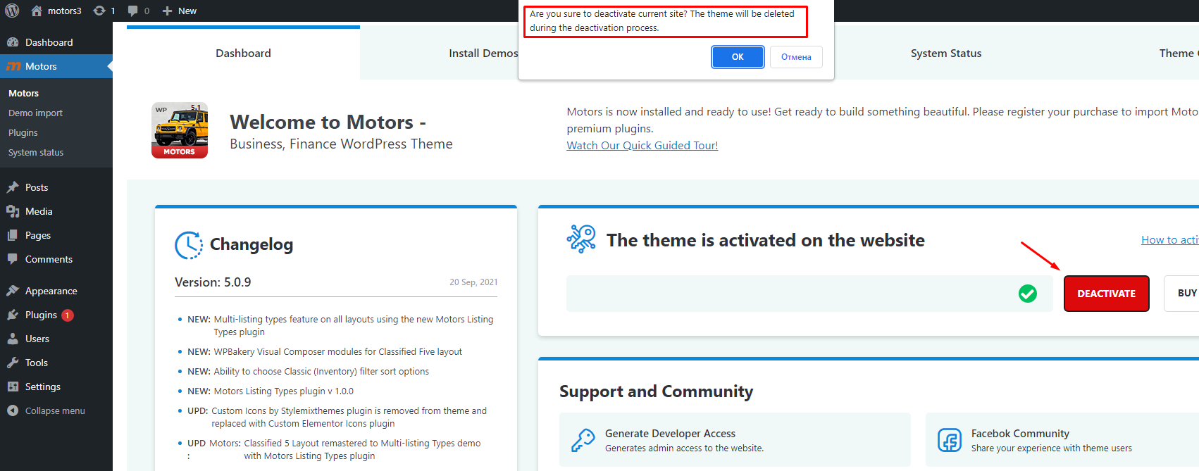 To reset the license key from the website, go to the Motors > Product Registration section on the WordPress dashboard. Click Deactivate button, you will receive a notification that you agree to deactivate, press the Ok button and the system reset the license key from the website and deletes the theme automatically.
