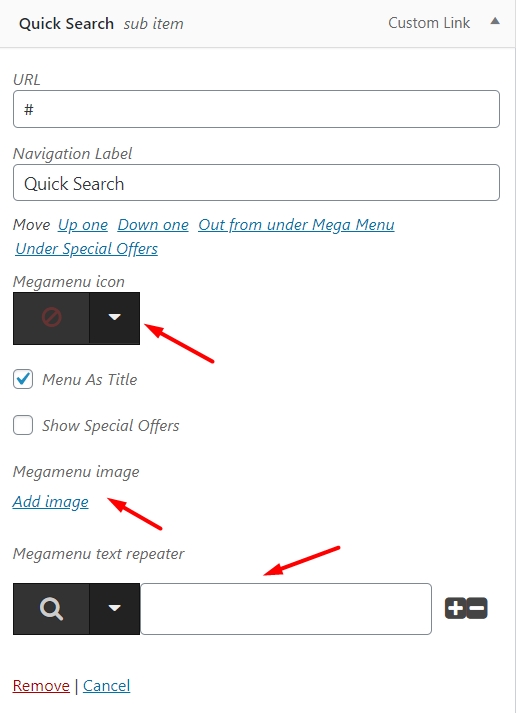 Draw your attention to the setting you have for each sub menu, they may vary a little depending on the structure. Dropdowns that identify columns have the following setups: icon selection, image adding, text content.