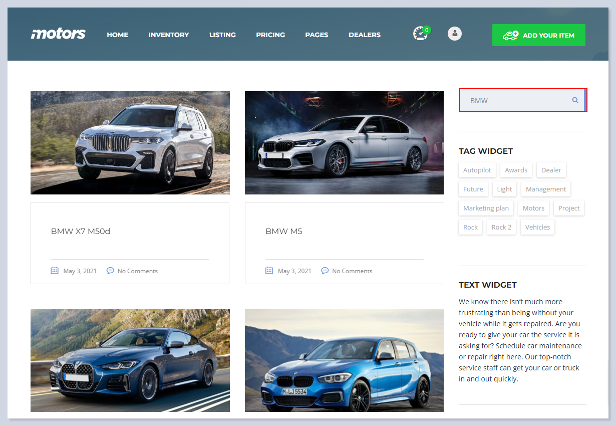 When enabled, this setting binds the **WordPress default search** option to the [**Search Results** (**Inventory) page**](https://docs.stylemixthemes.com/motors-theme-documentation/motors-plugin-settings/pages#listings-page-inventory)**.** So if you search something via **WordPress default search** the page will be redirected to the Inventory page