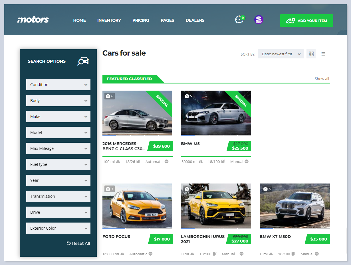 Sorting options may vary based on the [listing categories](https://docs.stylemixthemes.com/motors-theme-documentation/search-filter/inventory-listing-categories) and the [imported demo.](https://docs.stylemixthemes.com/motors-theme-documentation/getting-started/how-to-import-demo-content)