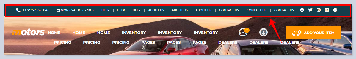 The settings for the Top Bar include several sections, such as Main Settings, Address, Working Hours, Phone Number, Menu, and Socials. Let's walk through each of them.