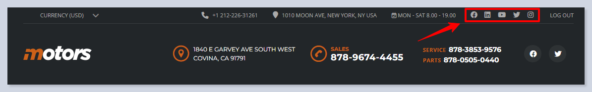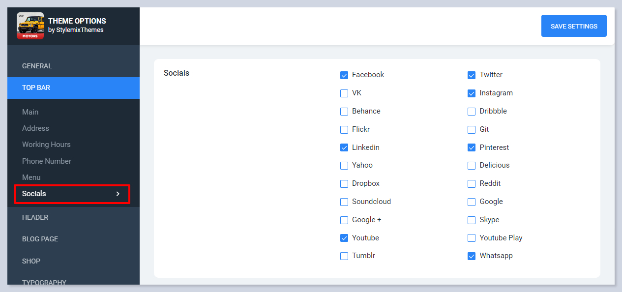 In the Socials section, you can select which social media links you prefer to display on your top bar: