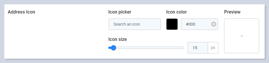 You can choose the Address Icon from the available icons' range on the Icon Picker field and set icons' color and size on appropriate fields.