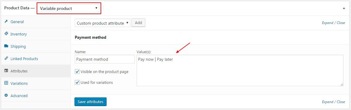 You can set simple or variable products under the Product Data -> Product type option. If you choose Variable Product, you can create product attributes like Payment Methods: