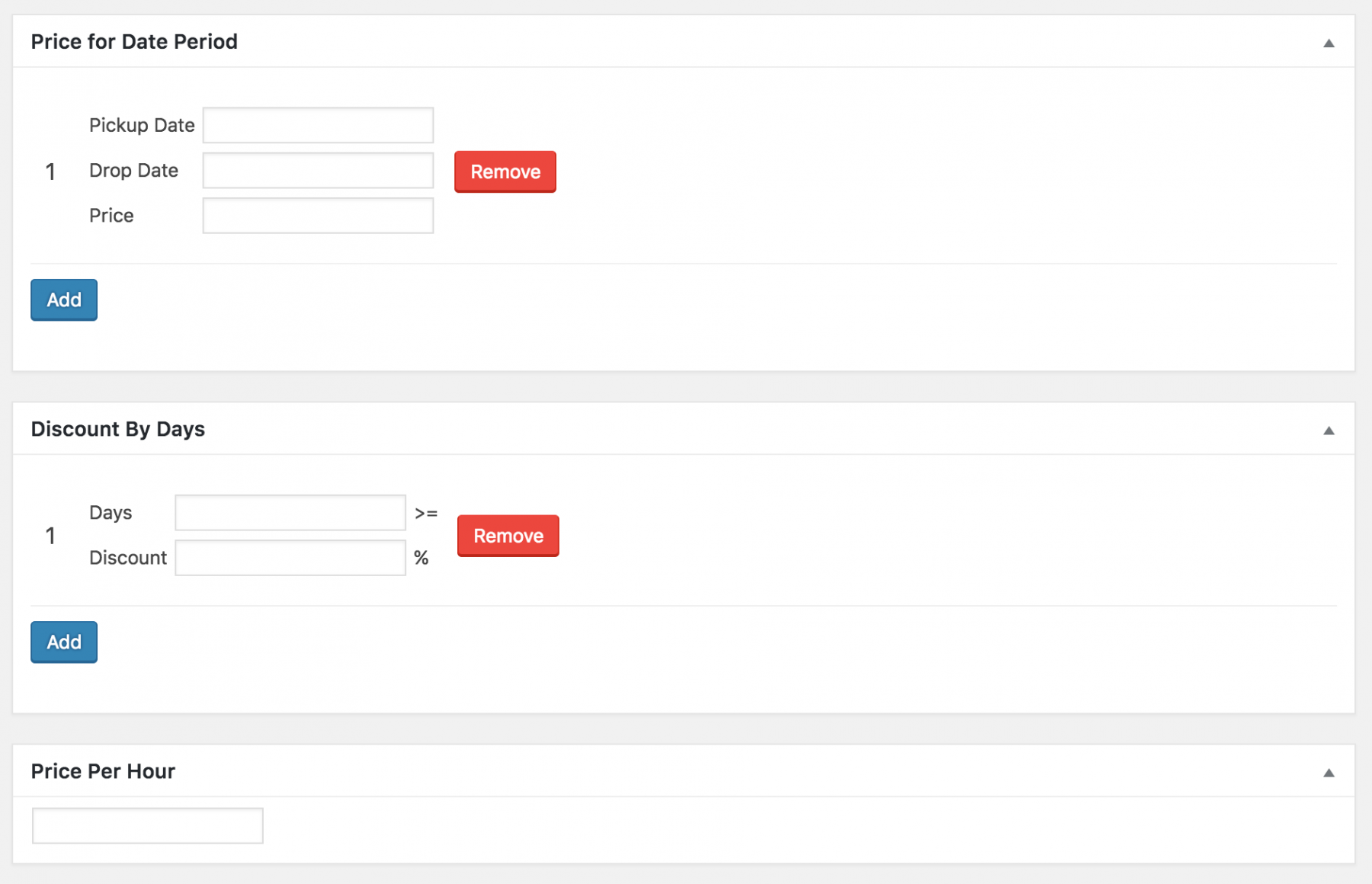 Also, you can set Discount, Pricing for special periods, and Price Per Hour options for your rental product.