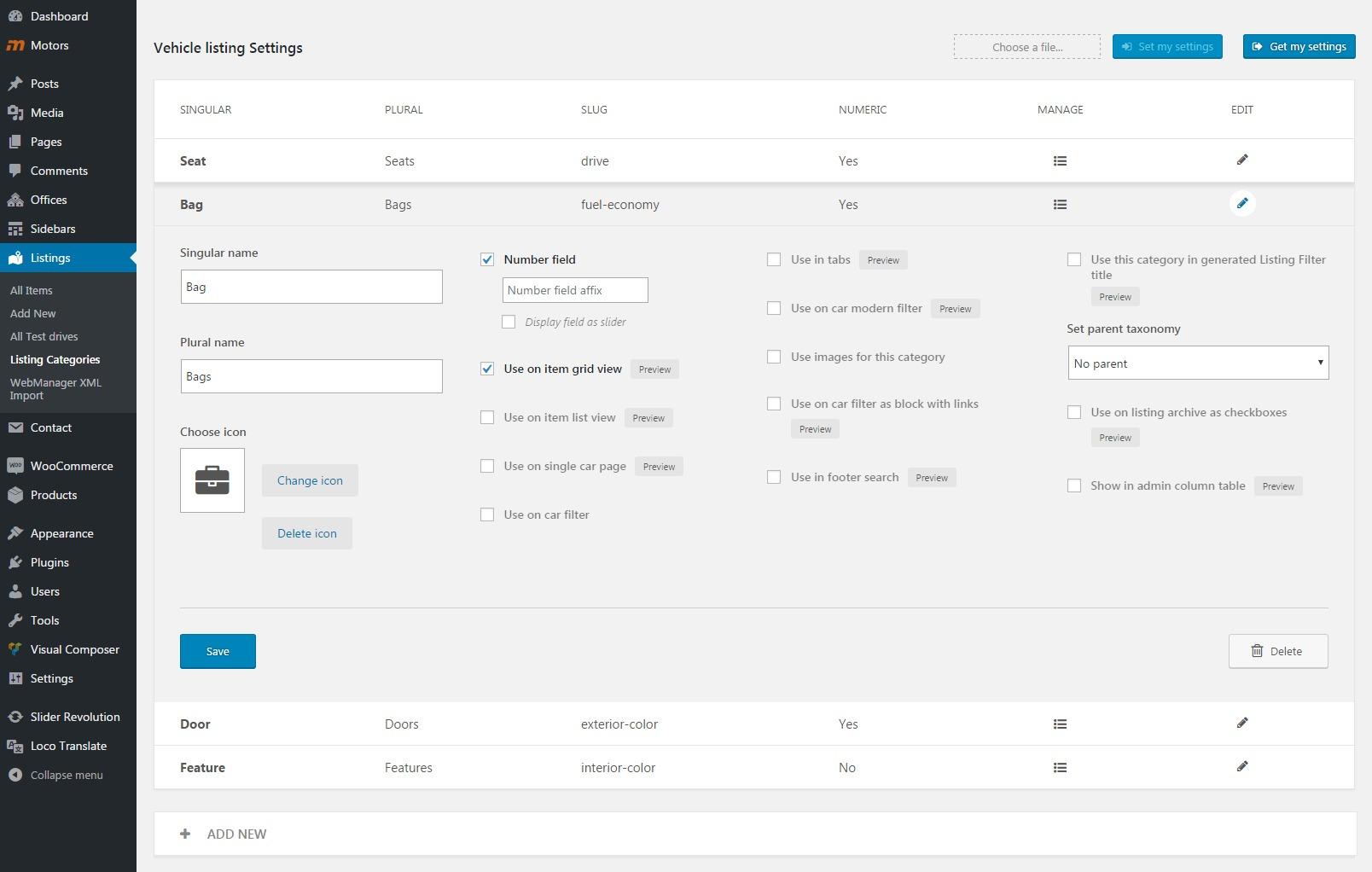 Main car details can be created under Dashboard -> Listings -> Listings Categories in the same way as standard Listing Categories in other layouts of the theme.