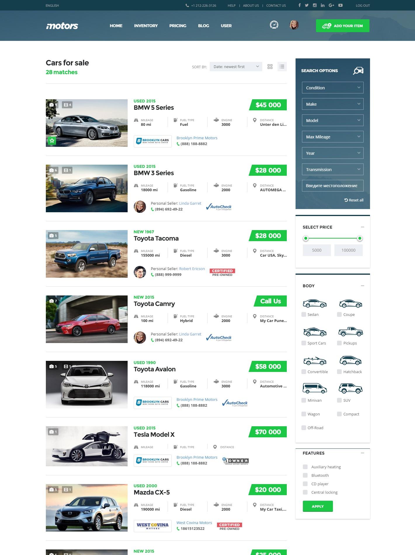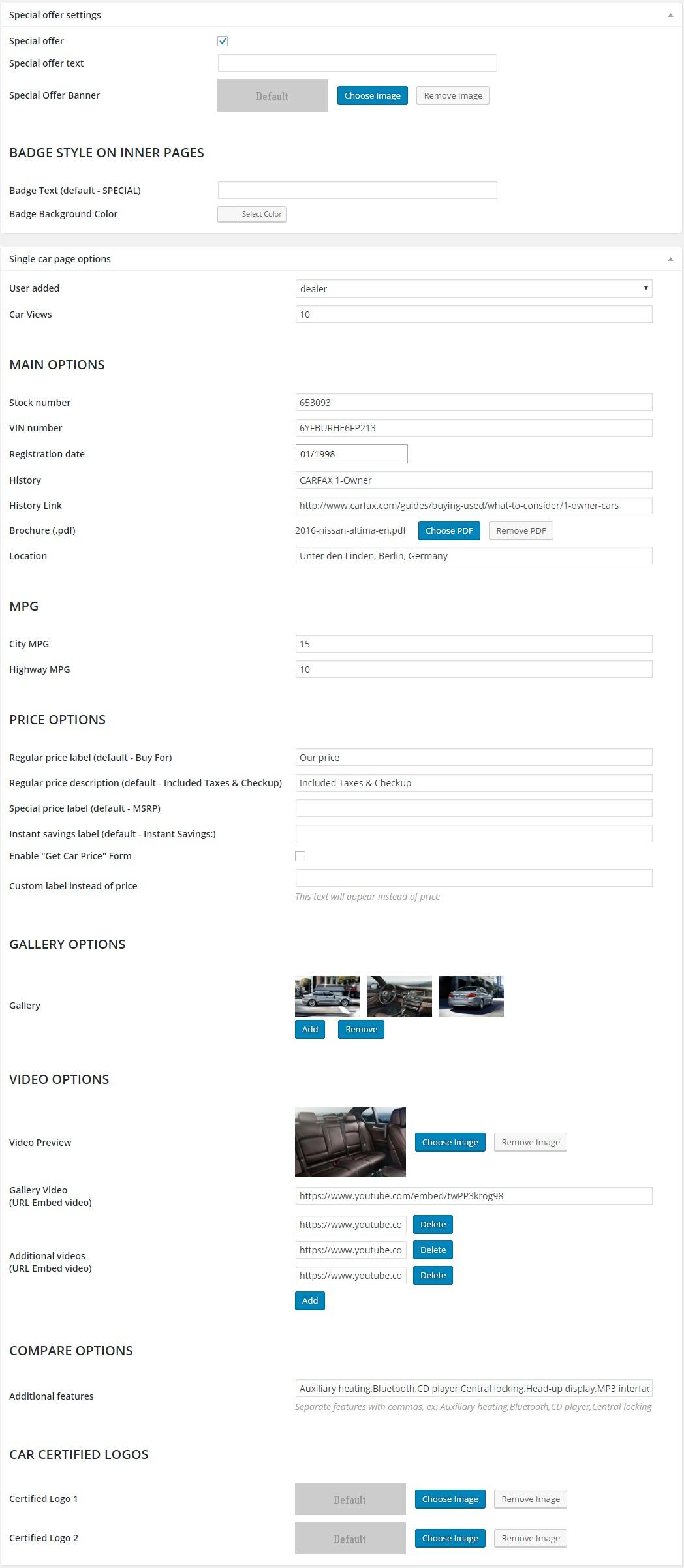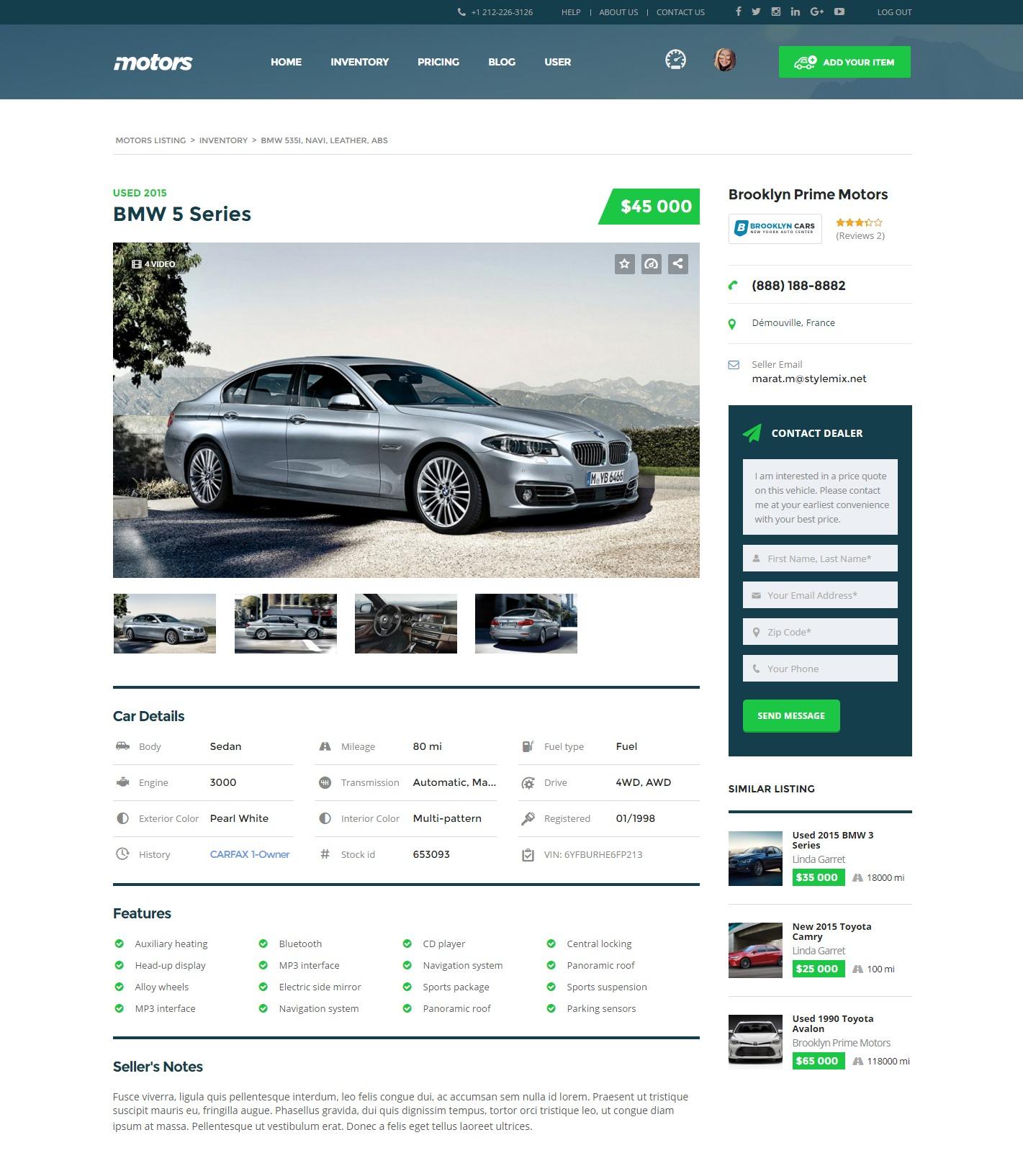 Respectively there are different layouts for a Single-Car page and additional fields like Reviews, Seller info, Car details, and Features.
