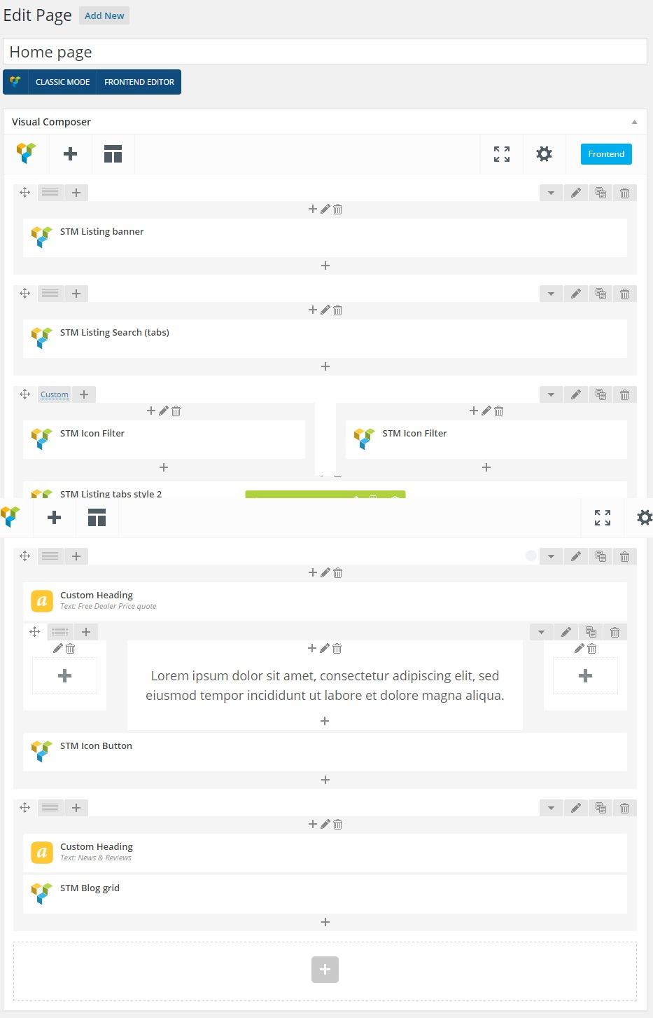 Classified layout Home page was built using above VC shortcodes. You can also customize this page easily through VC Editor: