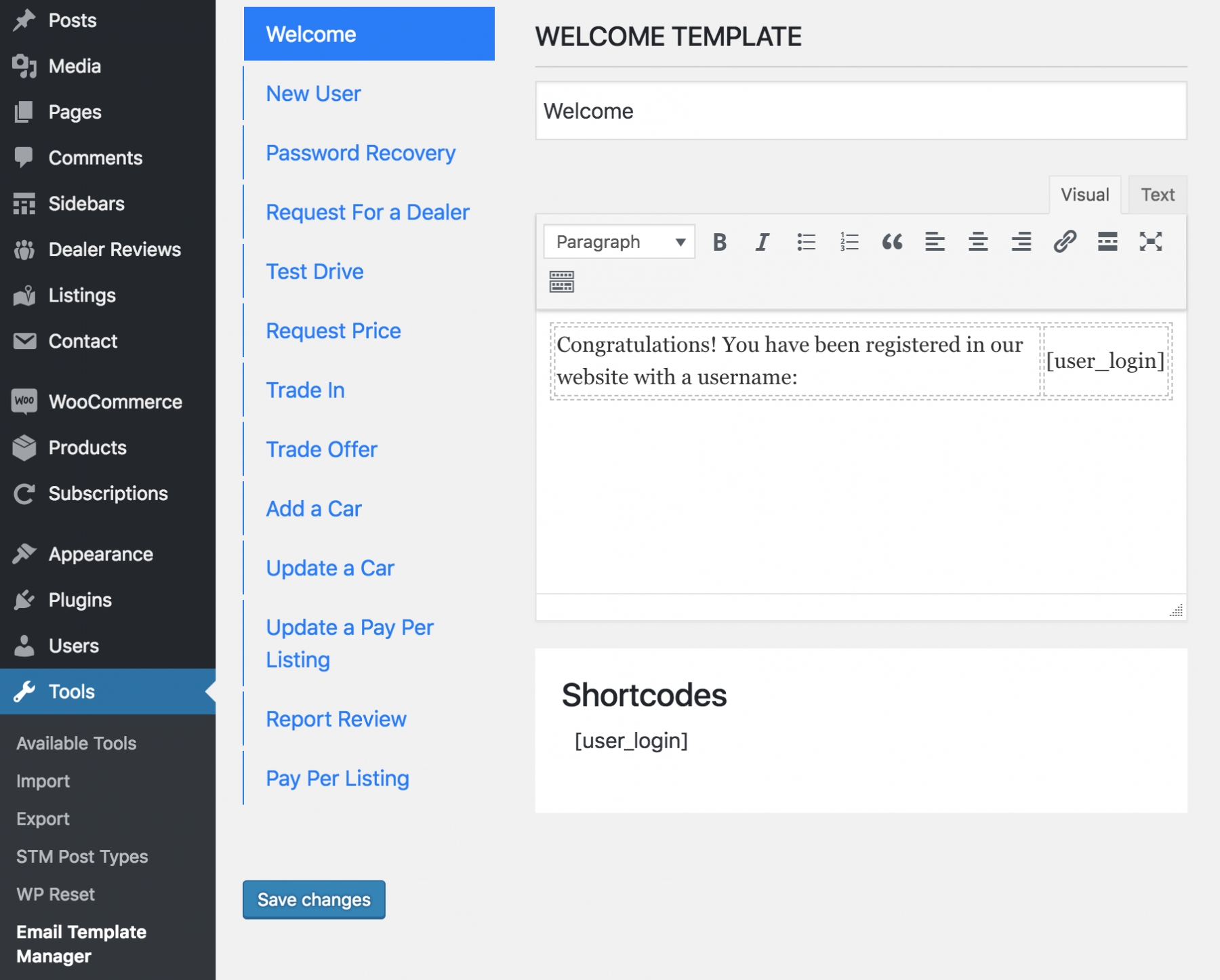 - User listing approved — users will be notified that the listing was approved and is now available on site. The same shortcodes are available: [car_id] and [car_title].