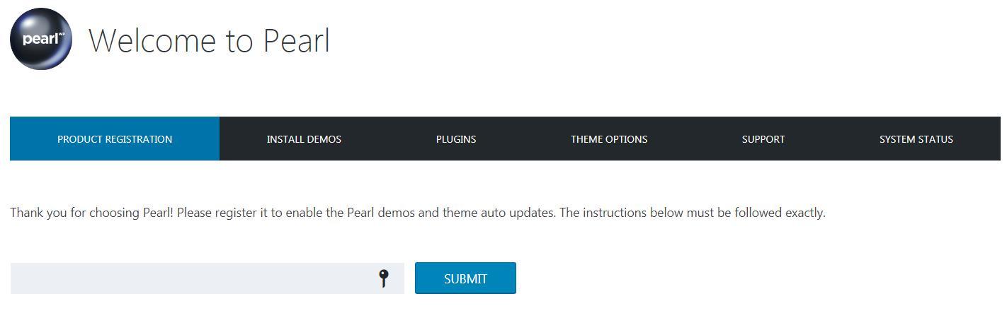 After completing the installation of the theme, you need to activate your product under Dashboard -> Pearl following these instructions:
