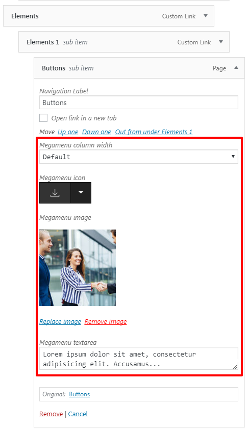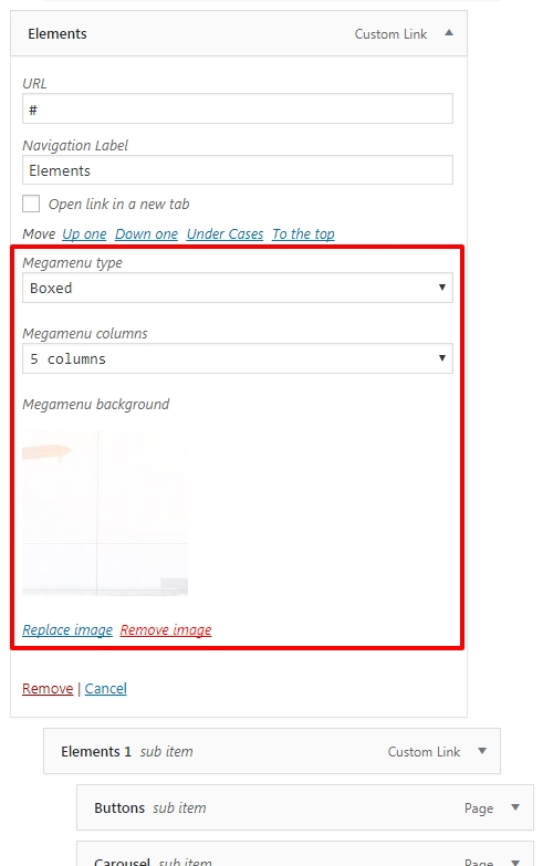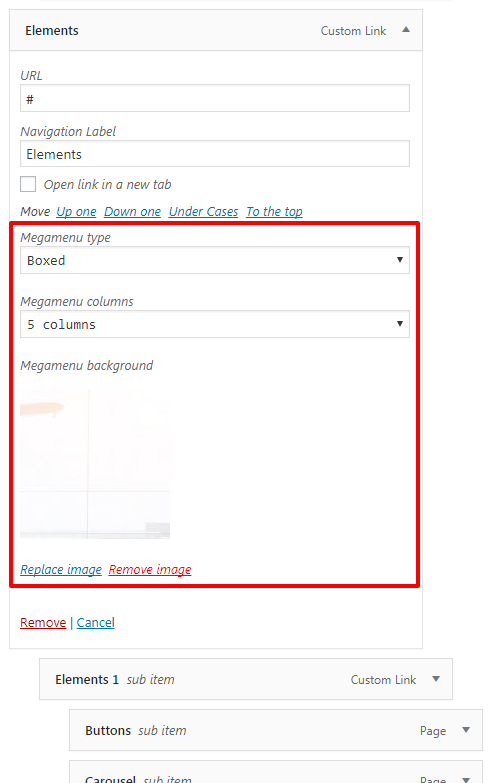 Mega Menu child elements also have special options such: