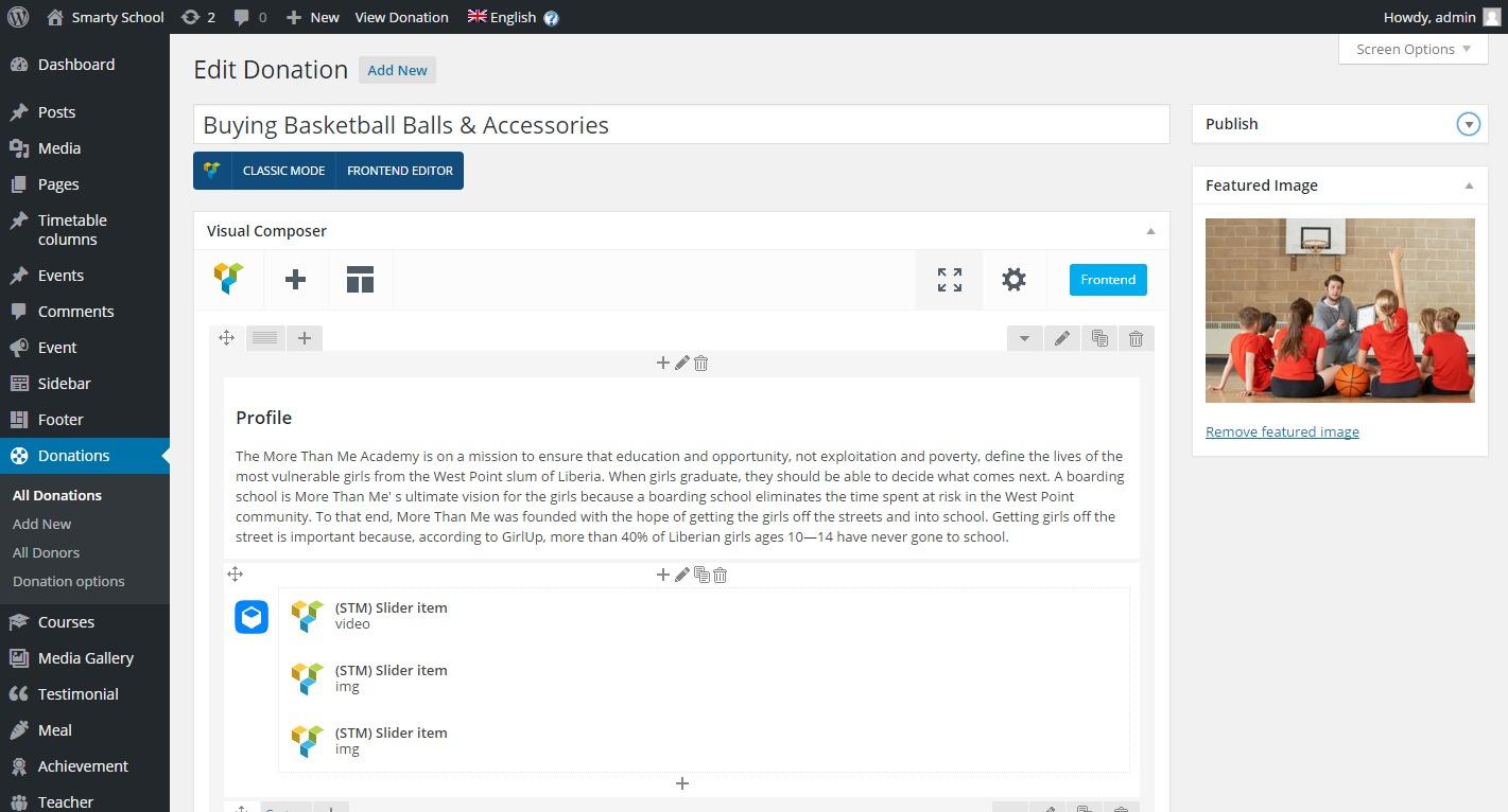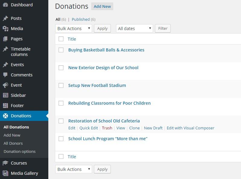 Donations are created as another custom post type called Testimonials. It has Categories that can be ordered as needed and All Donors list. Here you create just single donation.