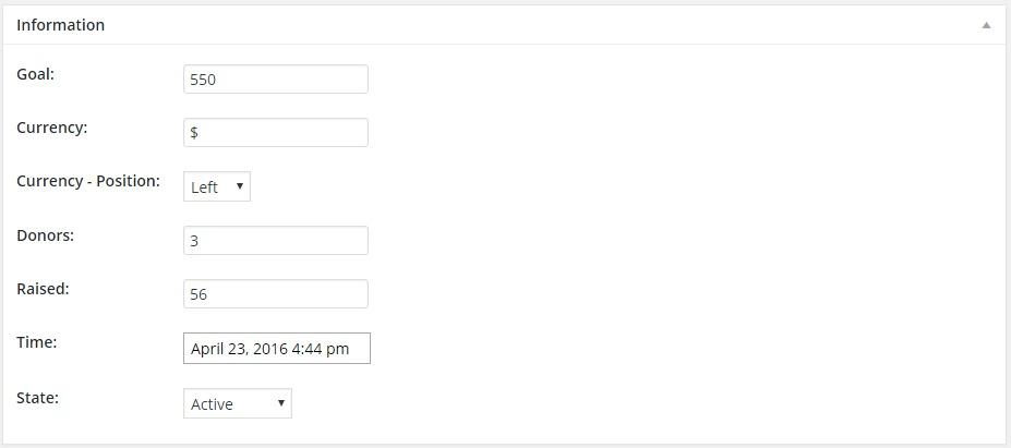 You can add an Image, Title and Category(es) for each Work post. Besides this you need to add Donation information under Information tab: