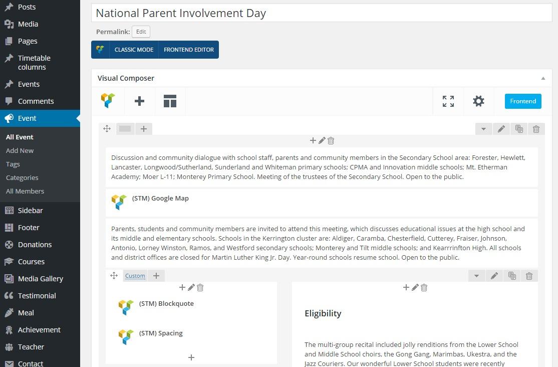 There is a custom post type to describe your Events via any element visual composer offers you. You can create them under Events menu.