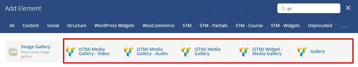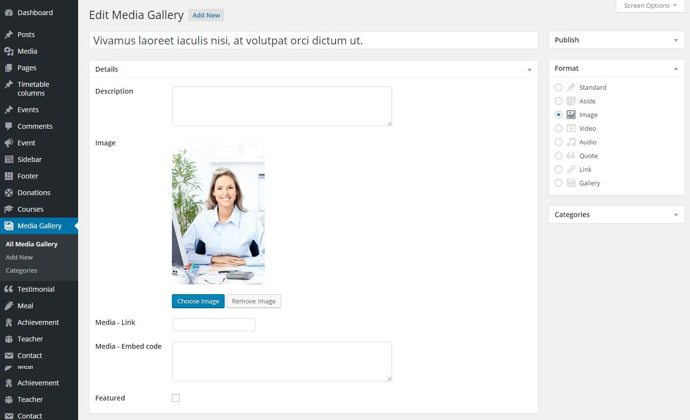 Besides Title and Images you can set Gallery Format, Category(es), Description, Link or Embed code for each gallery post. Also it’s possible to set a post as a Featured. For displaying your Media Gallery you can use one of the extra VC Modules in any page.