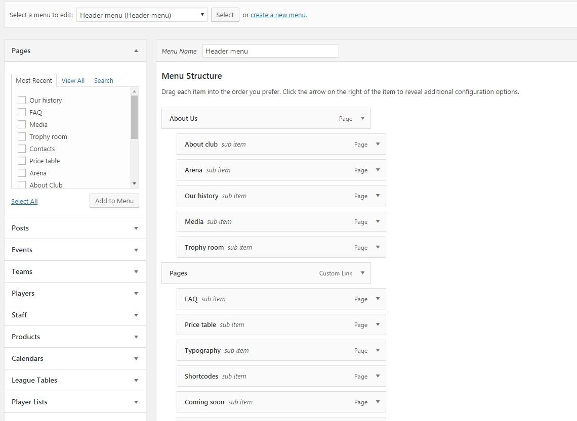 There are two navigations on the site – Header menu and Footer menu, so you can adjust them under Appearance -> Menus