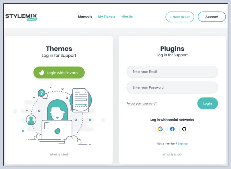 In the Support Portal, you can see documentation and tutorials for all products and create a support ticket. This is a portal for the theme and plugin users.