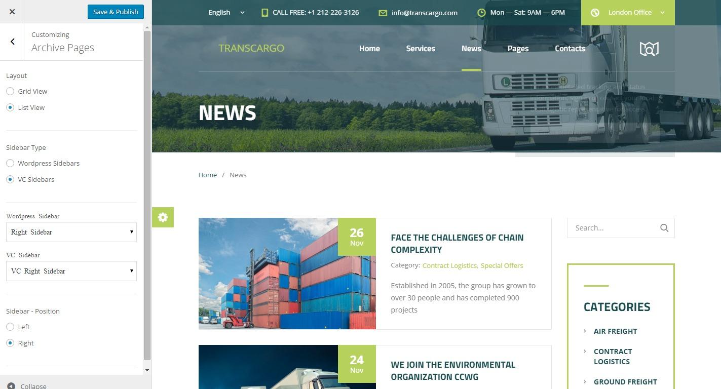 The blog page can have the sidebar on the left, right or no sidebar, and the contents of the sidebar, as described above, are set under the Appearance -> Widgets. Other settings of this archive page you can setup via Appearance -> Customize -> Archive pages:
