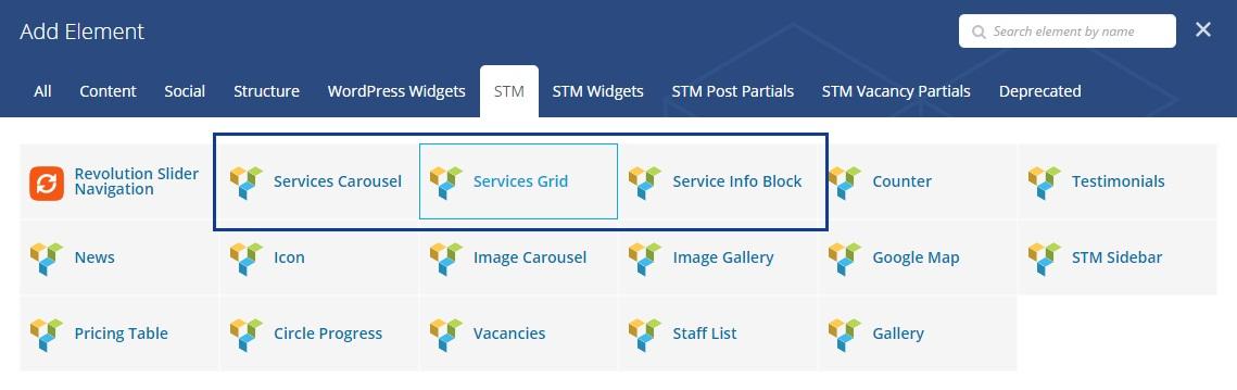 Also you can add Services as a Grid or Carousel for any page using custom STM VC elements: