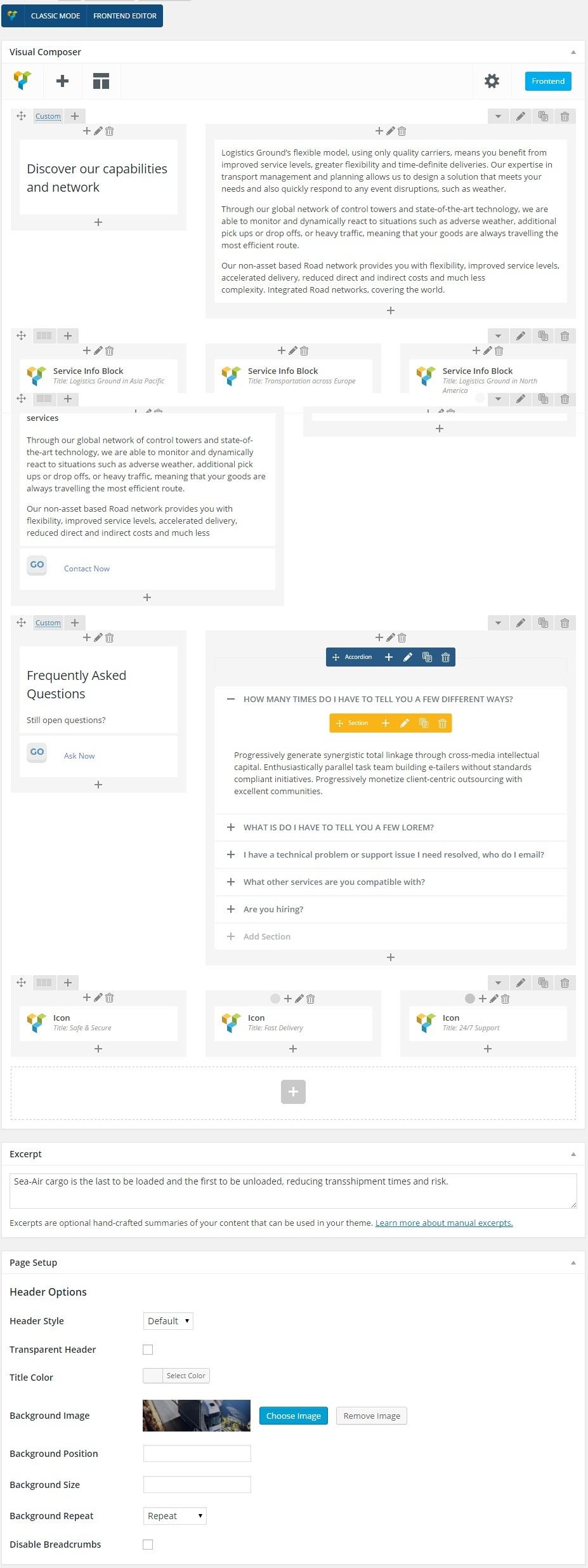 There is a custom post type to describe a service your company offer via any element visual composer offers you: