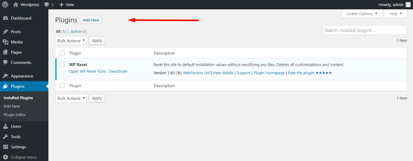 In the second way, navigate to your WordPress “Plugins” page, inside of your WordPress dashboard click “Add New” and follow these instructions: