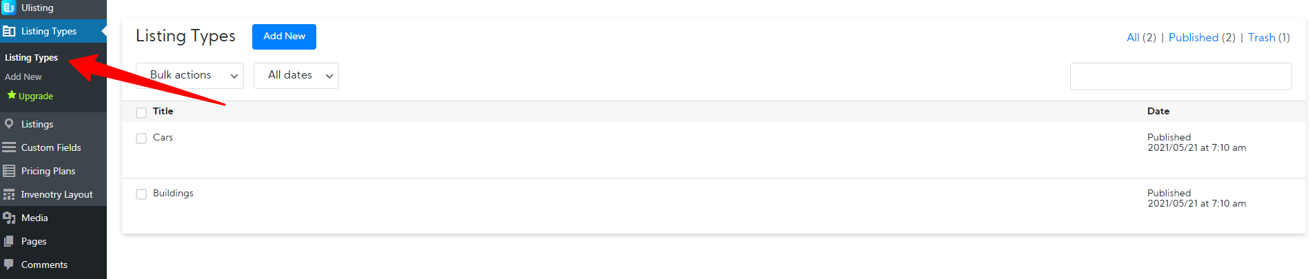 By default, the uListing Plugin Demo provides two built-in listing types, Cars, and Buildings.
